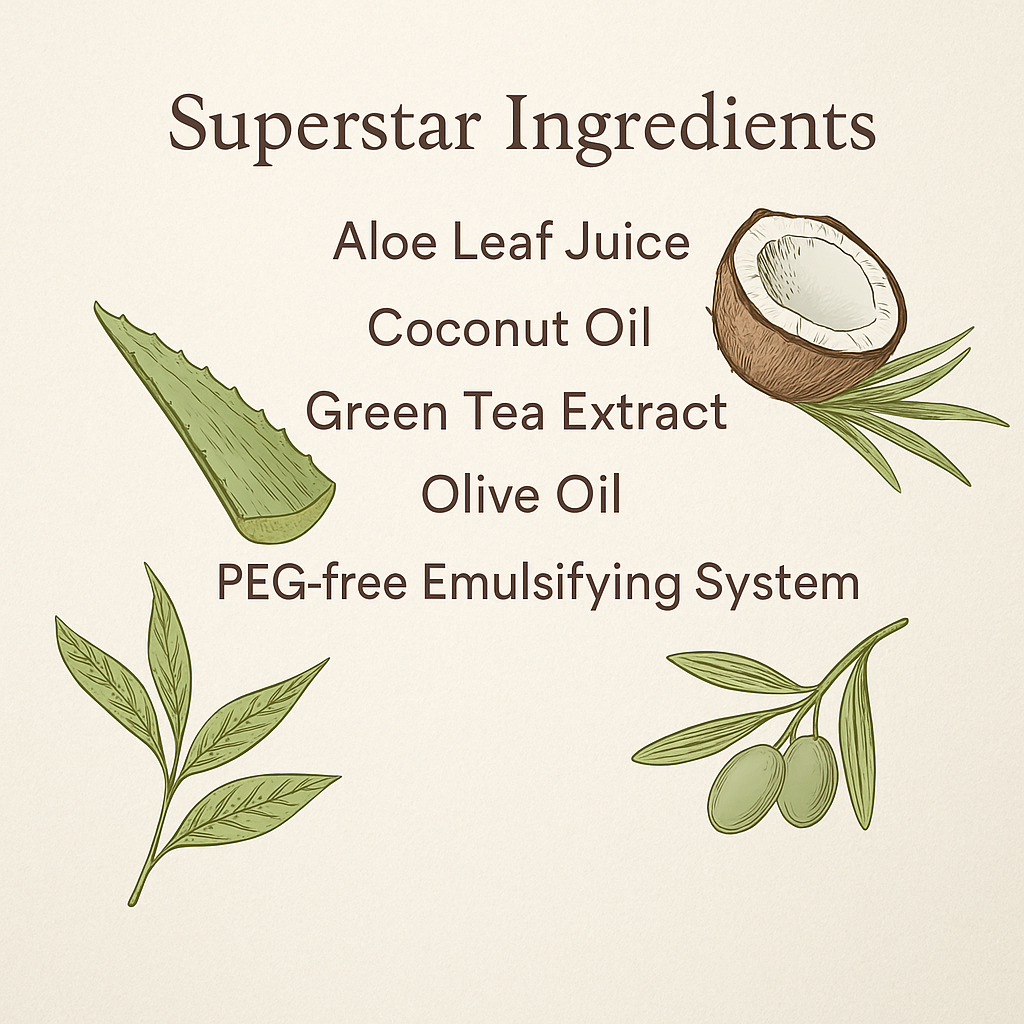 Aloe Leaf Juice, Olive Oil, Camellia (Green Tea) Extract, Coconut Oil, Glycerin, Emulsifying Wax, Stearic Acid, Phenoxyethanol (preservative), Ethylhexylglycerin, Vitamin E.